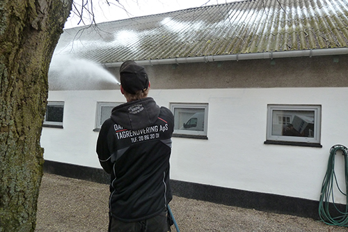 Taget sprøjtes med et miljøvenligt algemiddel som allerede har sin virkning efter 30 min, hvorefter de organiske alger starter forrådnelsesprocessen. Efter ca. 3 måneder vil de første resultater kunne ses.